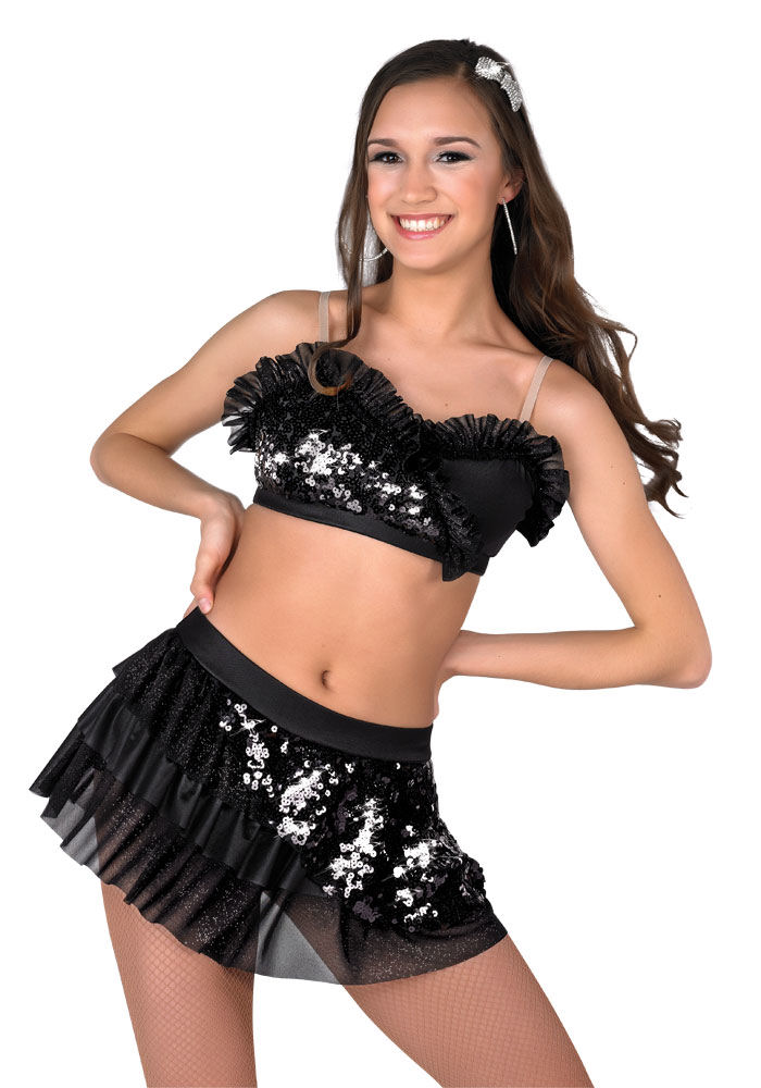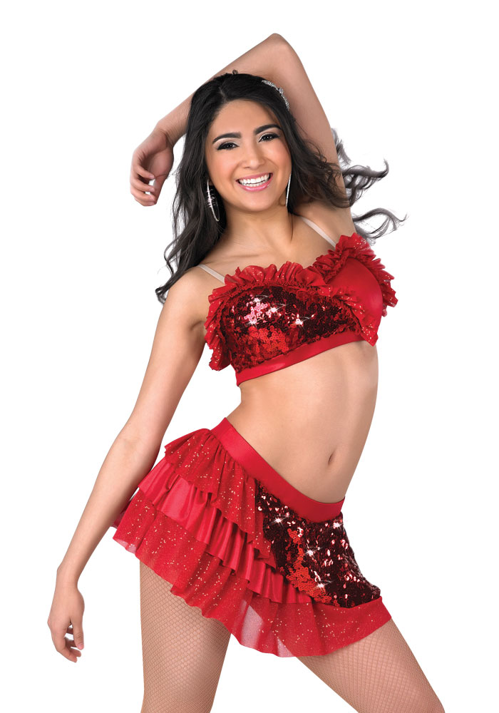 Lined varsity sequin spandex and glitter knit bra top with adjustable straps. Sequin and glitter knit tiered skirt over attached hot pants. Rhinestone bow headband sold separately. Colors: 27 Fuchsia, 51 Black, 52 Red, 58 Turquoise.