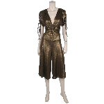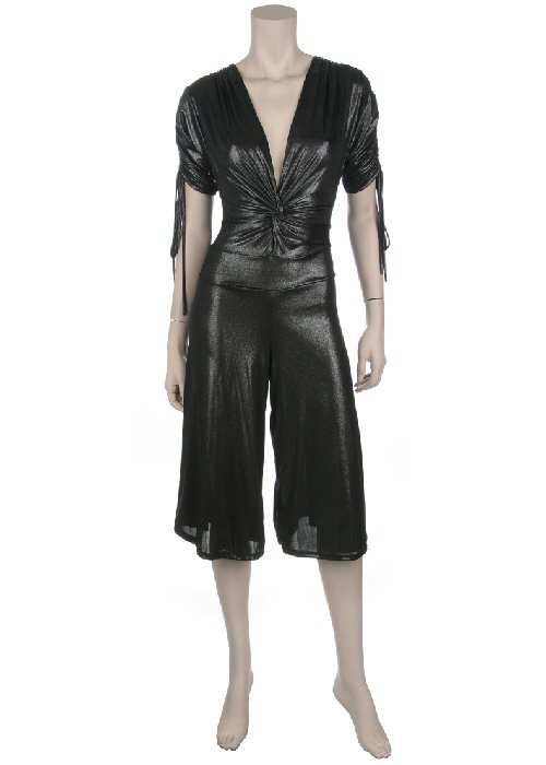 Sexy metallic black one pc pants outfit with deep v neck and short sleeves..