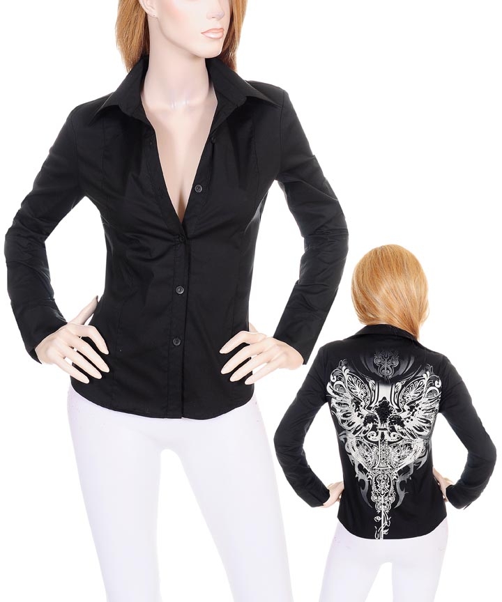 Cute button up collared top with embellished design on back
