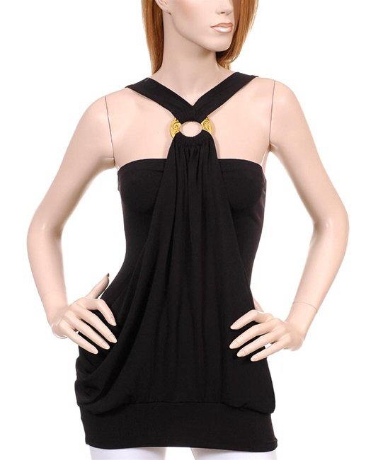 Tube underneath and oring accent with sexy overhang in front. Wide band hem.